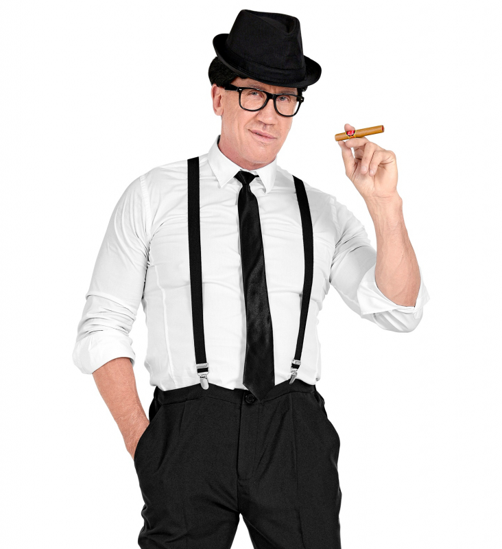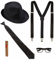 Kitet innehåller fem klassiska accessoarer: en stilfull hatt, retro glasögon, låtsascigarr, svarta hängslen och matchande slips. Tillsammans skapar de en ikonisk look som passar för en mängd olika maskeradtillfällen.