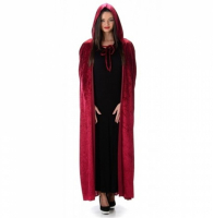 Cape med en lång längd med luva i ett sammetsliknande tyg i färgen vinröd eller blodröd, capen pasar till både män och kvinnor som ska fira halloween, capen knyts under hakan så att den sitter på plats snyggt från axlar och ner.