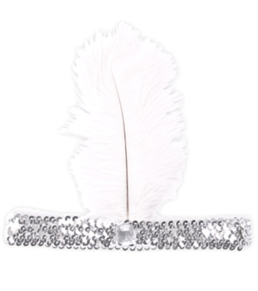 Pannbandet är töjbart och i storlek onesize, vilket passar det flesta. Pannbandet är täckt i silvriga paljetter och har en vit fjäder samt en glittrig diamant i plast fastsatt i mitten av bandet.