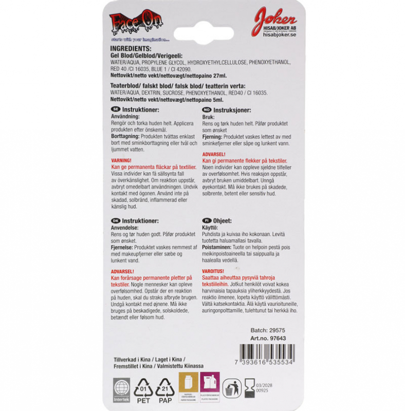 Skapa skrämmande realistiska effekter till Halloween, teater, cosplay eller film med vårt fakeblod i geléform! Den tjocka konsistensen gör att blodet ser extra äkta ut och stannar kvar där du applicerar det – perfekt för sårsmink, läskiga specialeffekter och detaljerade makeuplookar.