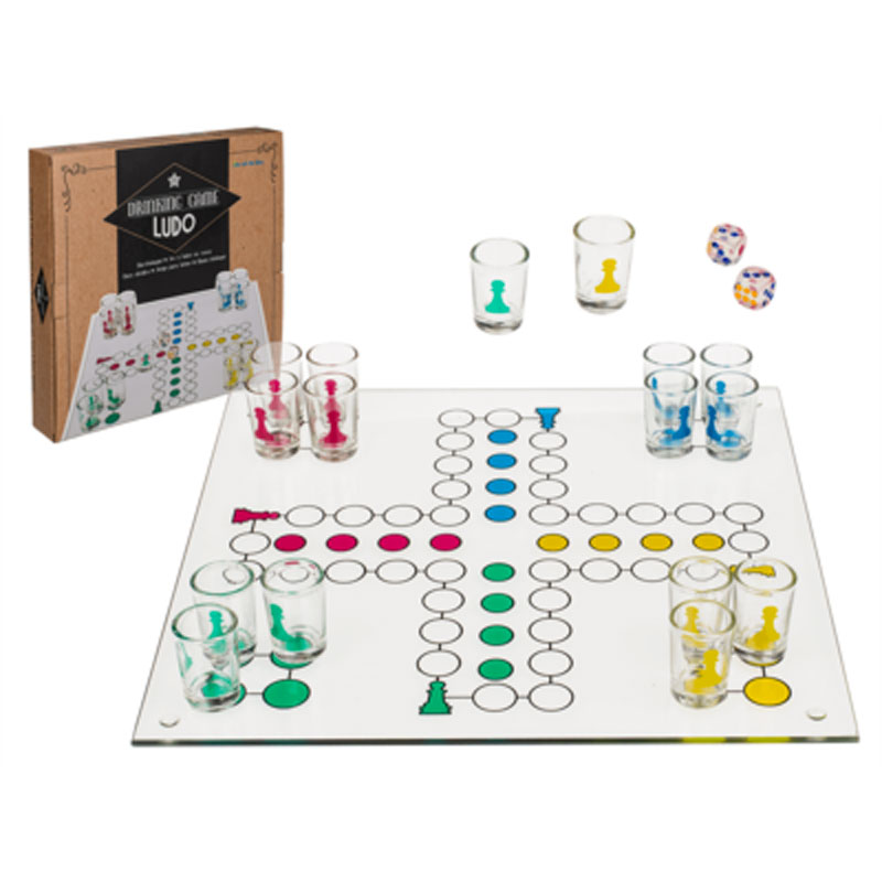 Spelplanen är av glas 35 cm x 35 cm med glas 2 cl. och två tärningar