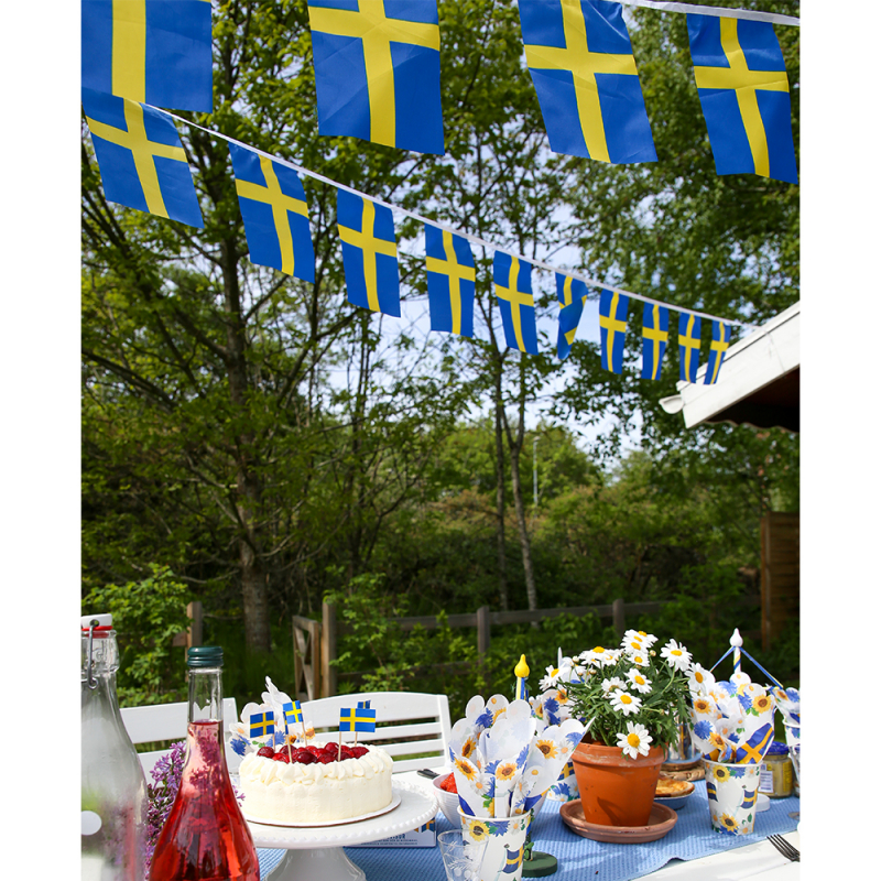 Med hela 6 meter och 25 flaggor får du gott om längd för att verkligen rama in festen. Perfekt över buffébordet, längs staketet eller som bakgrund till både studentbilder och midsommarbilder.