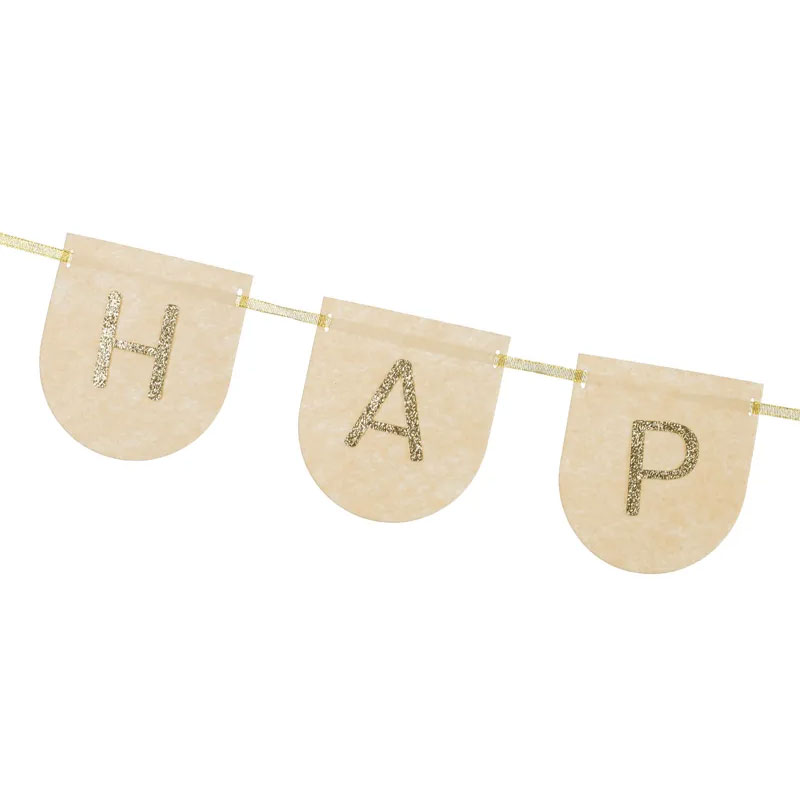 En söt girlang tillverkad i filt. En dekoration som passar utmärkt till födelsedagsfirandet och barnkalaset. Bokstäverna är i en guld-glittrig färg och tyget är i en nyans av beige och peach. Girlangen består av bokstäverna Happy Birthday samt två blommor.