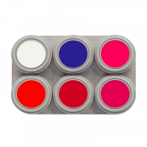 En palett från märket Grimas med 6st färgstarka UV-färger för huden. Färgerna är vattenbaserade och blir självlysande när de kommer i kontakt med UV-ljus.