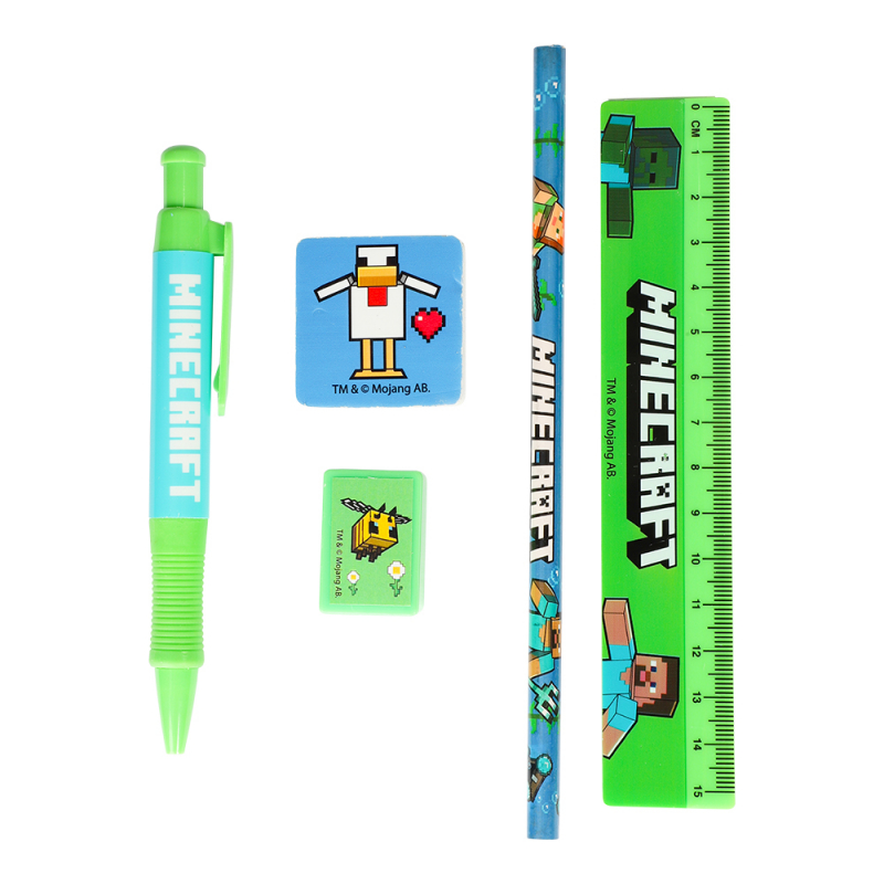 Innehåller: Blyertspenna, bläckpenna, linjal, pennvässare och radergummi – allt i Minecraft-motiv