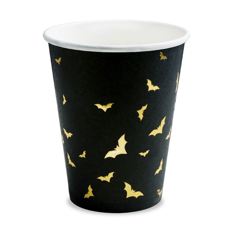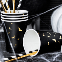 Effektfulla ballonger med svart bakgrund och detaljer av små fladdermöss i guld. En perf...