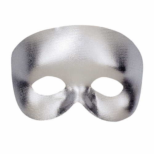 En silvrig ögonmask i modell "Casanova" i vuxenstorlek. Ansiktsmasken fästes med ett svart gummiband runt huvudet.