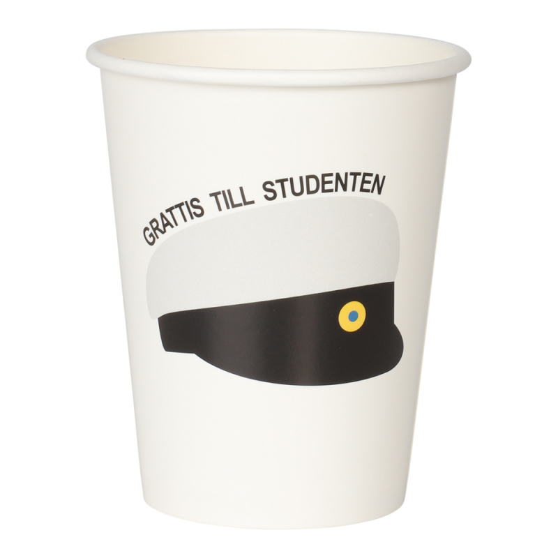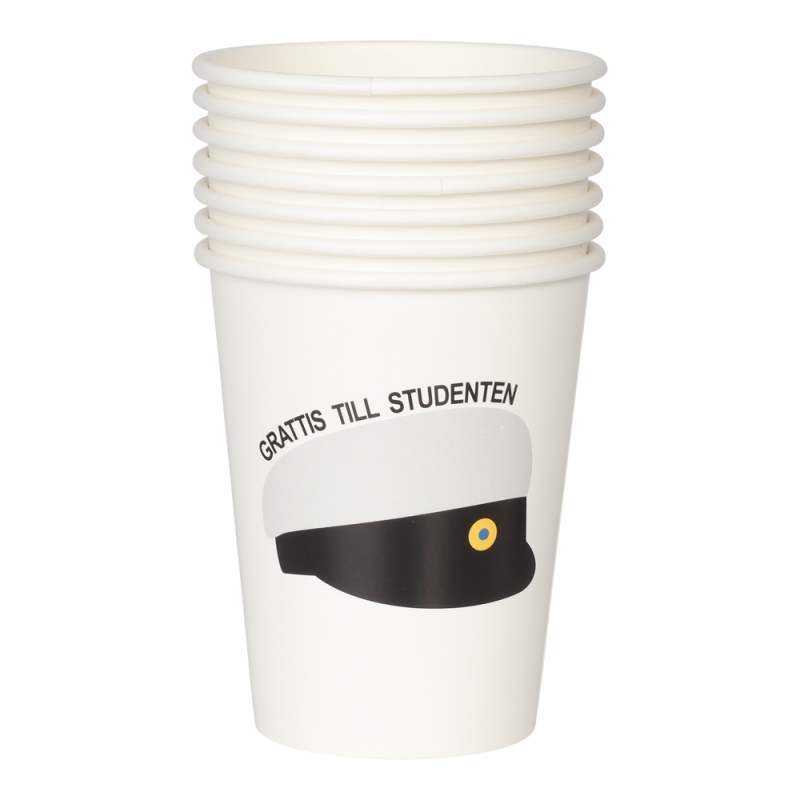 Duka upp till ett lyckat studentfirande med våra pappersmuggar med studentmössa. Dessa vita engångsmuggar till studentfesten är dekorerade med ett klassiskt motiv av en studentmössa samt texten “Grattis till studenten” perfekt för att skapa rätt känsla på studentmottagning och examen.