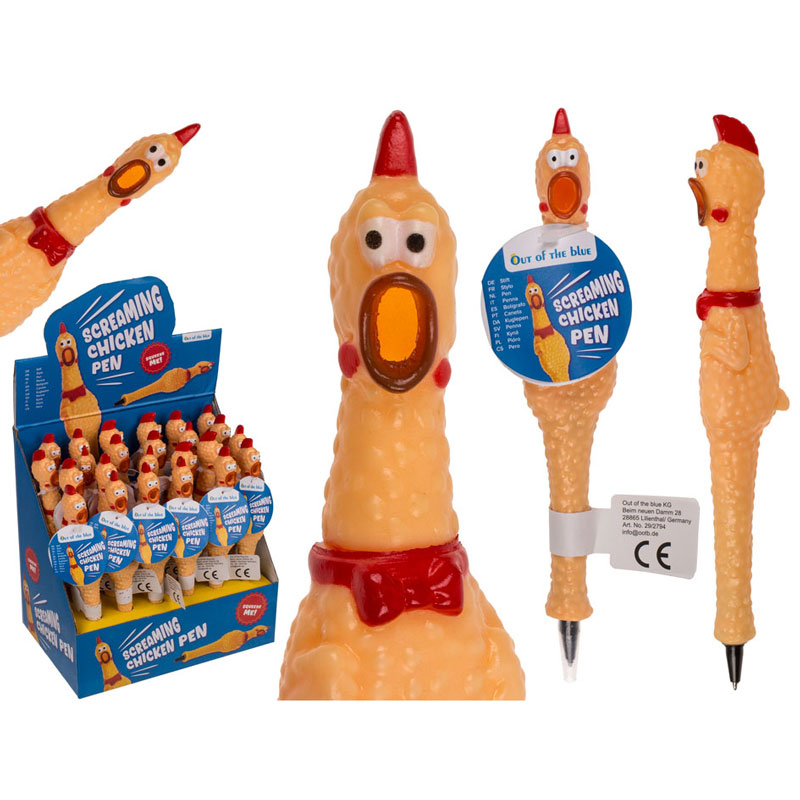 Ge skrivbordet en lekfull twist med denna 18 cm långa penna med kycklingmotiv! Tryck på den mjuka kycklingen och ett roligt skrikande ljud hörs – perfekt för skratt på kontoret, hemma eller i skolan.