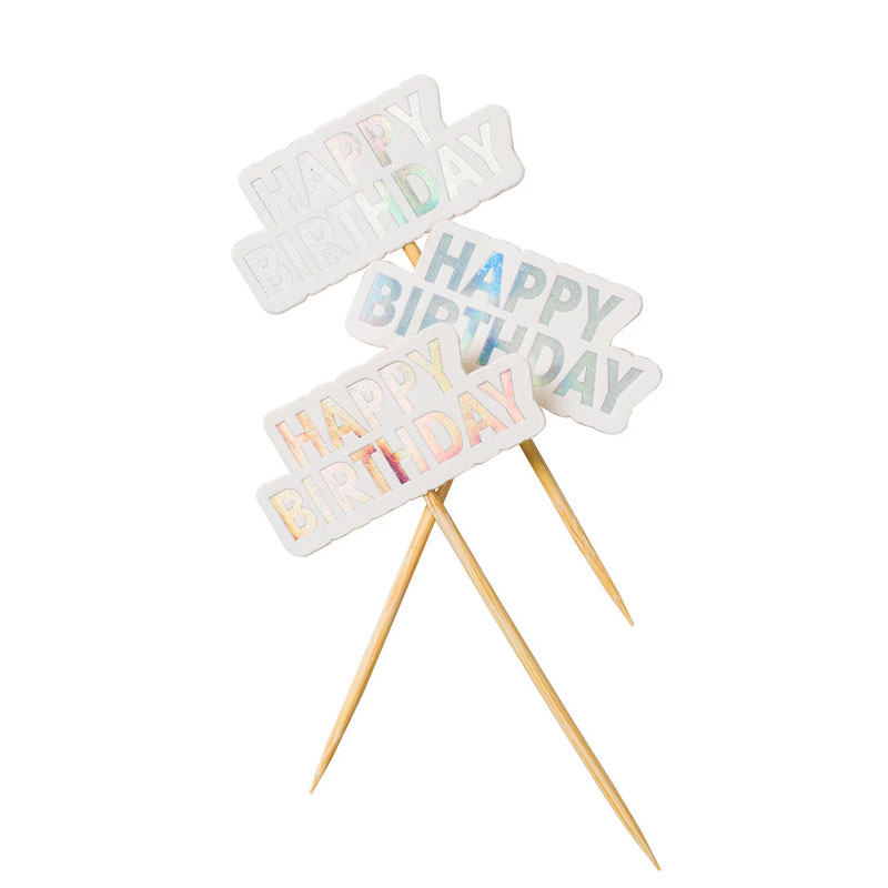 Dekorera tårtan med stil med våra cake toppers i papper med träpinne och texten “Happy Birthday” i skimrande iridescentfolie. De ger en festlig och elegant känsla som lyfter både födelsedagstårtor och cupcakes.