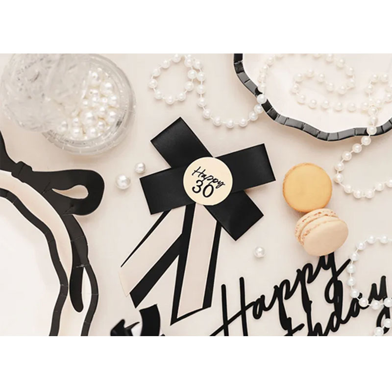 Eleganta och vackra tallrikar som pryds av texten happy birthday samt en svart stor rosett. Dessa ...