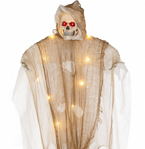 Skelett spöke i vit kåpa med säckväv och lysande röda ögon och under hela kåpan  lyser det vita ledlampor som ger en lite läskig känsla precis som halloween.