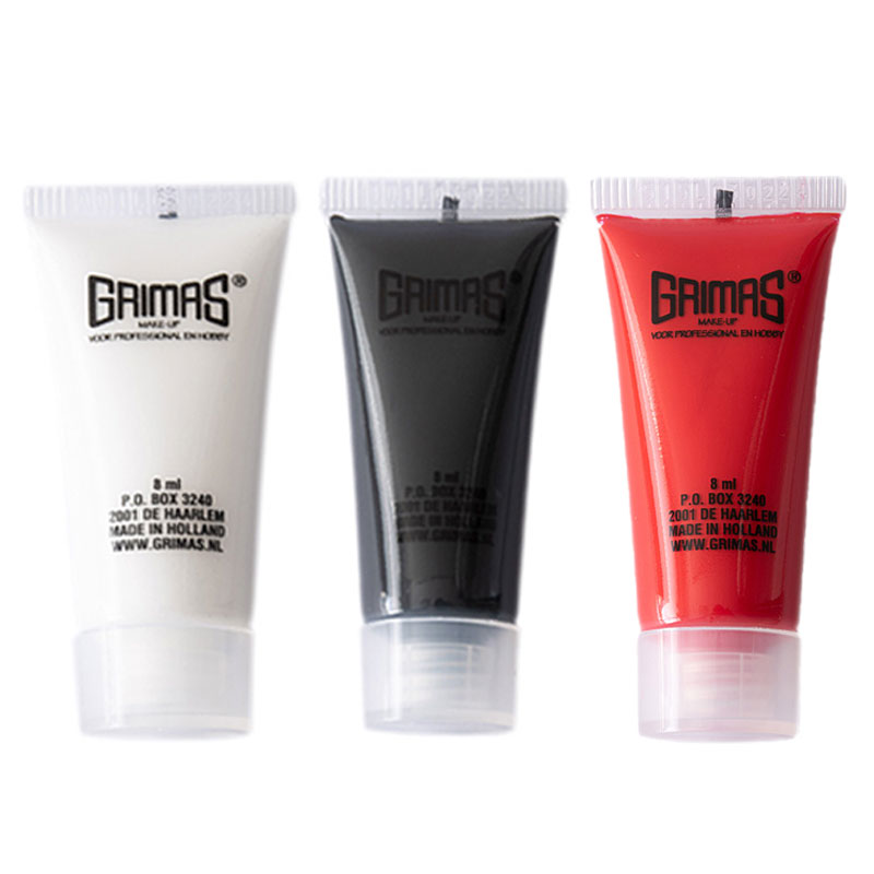 Ska du på halloweenfest och vill skapa en riktigt effektfull look? Då är detta 3-pack med flytande kroppsfärger från Grimas ett måste! Setet innehåller tre klassiska färger – svart, vit och röd – perfekta för allt från skelett och vampyrer till clowner, zombies eller blodiga karaktärer.