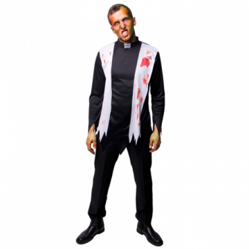 Maskeraddräkten finns i storlek onesize och inkluderar svart skjorta med prästkrage och vit blodig sjal runt axlarna. Den avhuggna plasthanden ingår EJ, men kan enkelt köpas till!